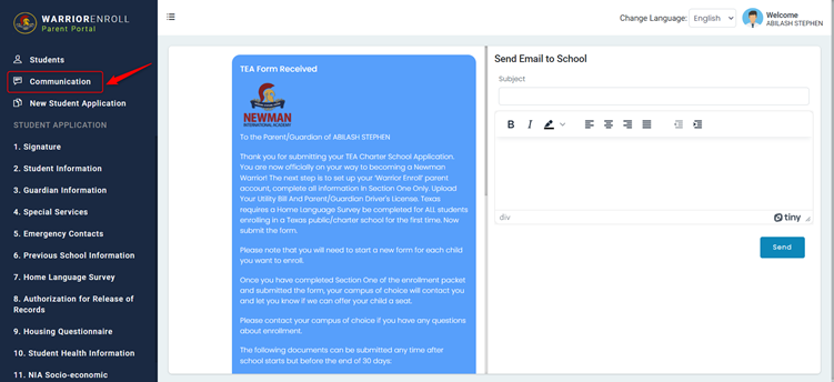 - On the right side, you can send emails to the school, facilitating easy communication between you and the school staff.