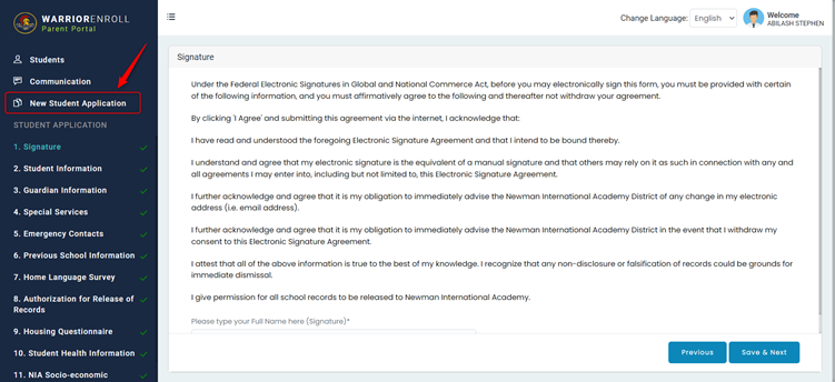 - To begin a new student application, click on the “New Student Application” button. This will direct you to the TEA Form page.