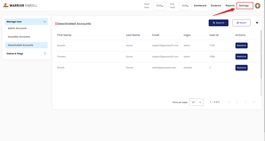 The Settings page allows you to manage user accounts within the system, including Admin, Guardian, and Deactivated accounts. From this page, you can: