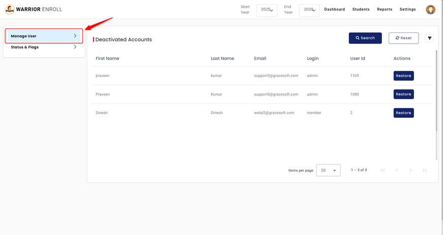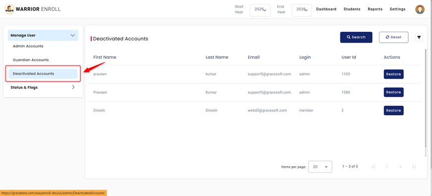 In the Deactivated Accounts section, you can manage users who have been deactivated but may need to be restored.