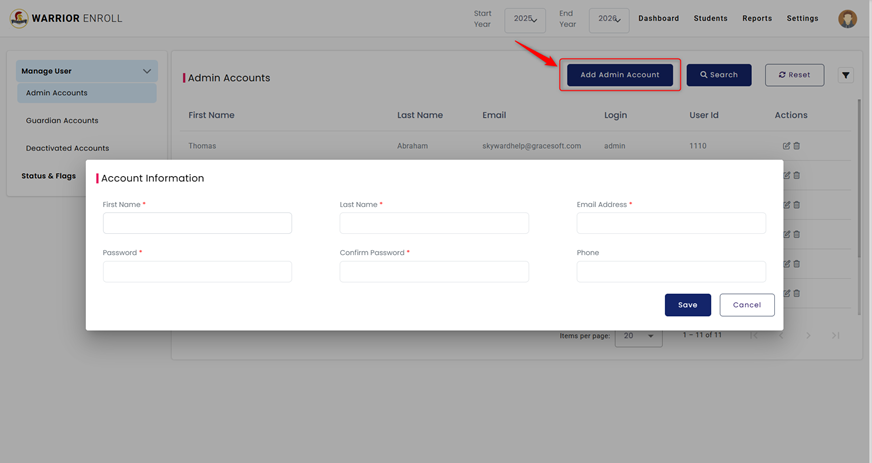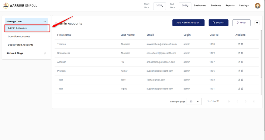 In the Admin Accounts section, you can manage all the admin-level users in the system.