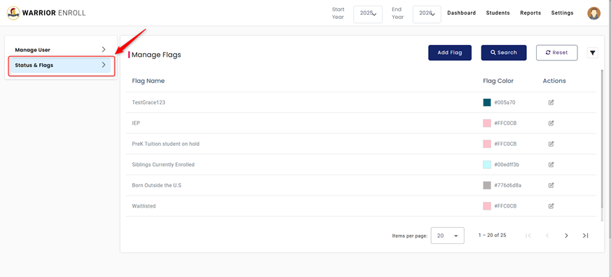 The Status & Flags dropdown allows users to manage and customize system statuses and flags for better categorization and visual tracking. This section consists of two options: Manage Status and Manage Flags.