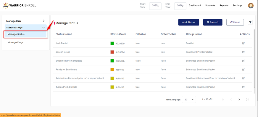 The Manage Status section lets you view, create, and edit custom statuses used within the system.