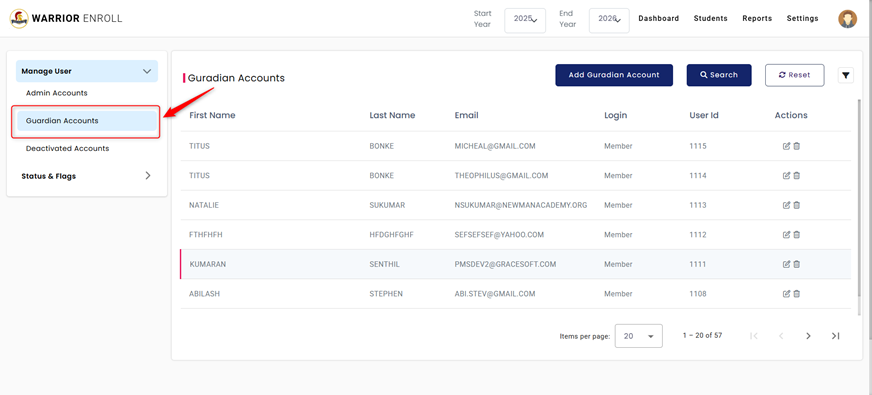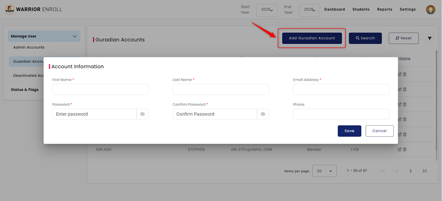 In the Guardian Accounts section, you can manage all the user accounts with Guardian privileges.
