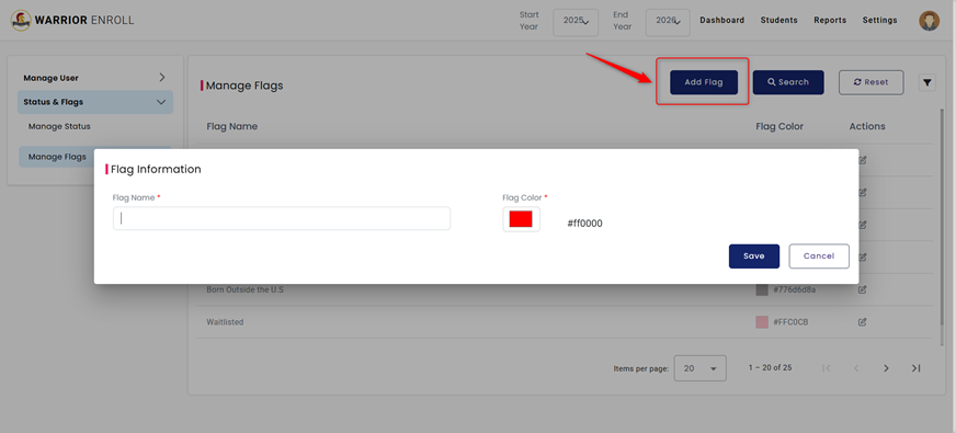 Clicking the ADD Flag button opens a pop-up titled Flag Information, where you can create a new flag using the following options: