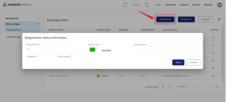 Clicking the ADD Status button opens a pop-up titled Registration Status Information, where you can define your status using the following fields: