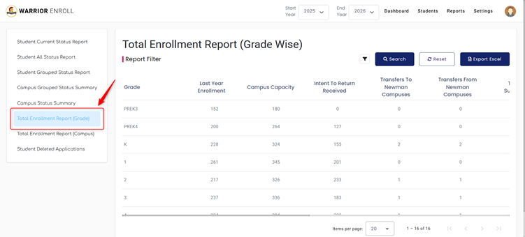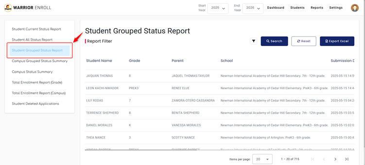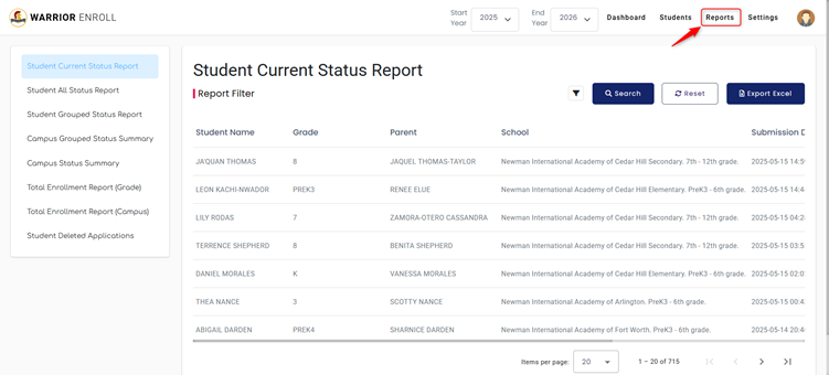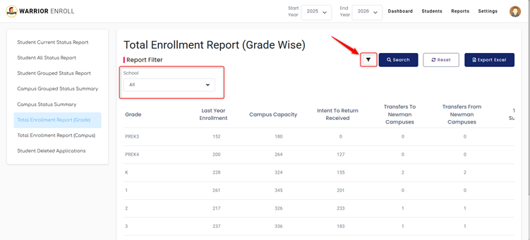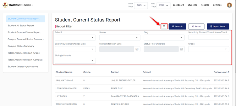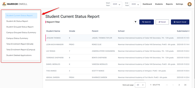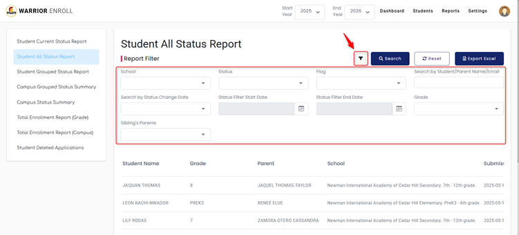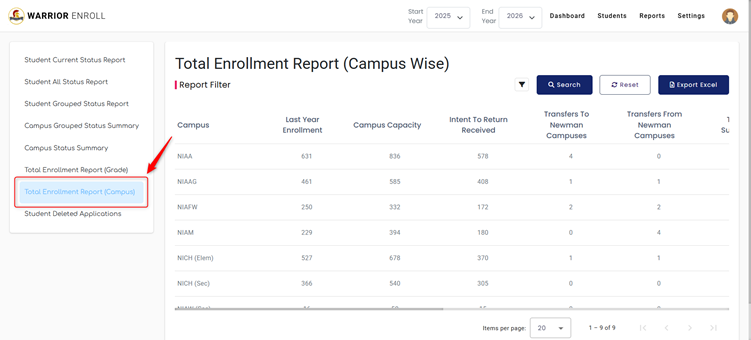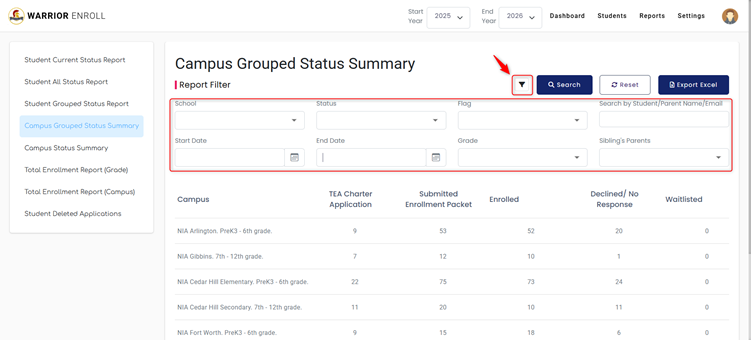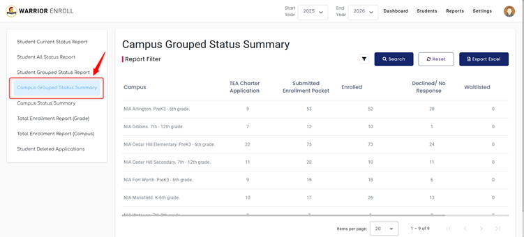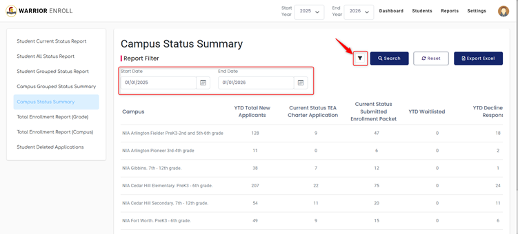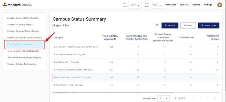 This module provides users with in-depth access to application and enrollment data through a set of predefined reports. Each report is designed to provide insights into student status, campus summaries, and overall enrollment metrics. The documentation below outlines how to access these reports and explains the content and functionality of each one.