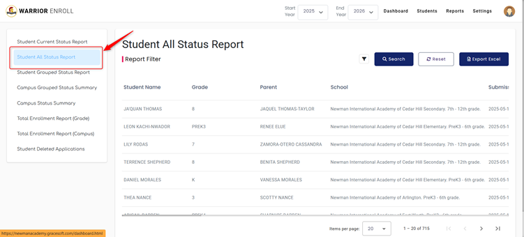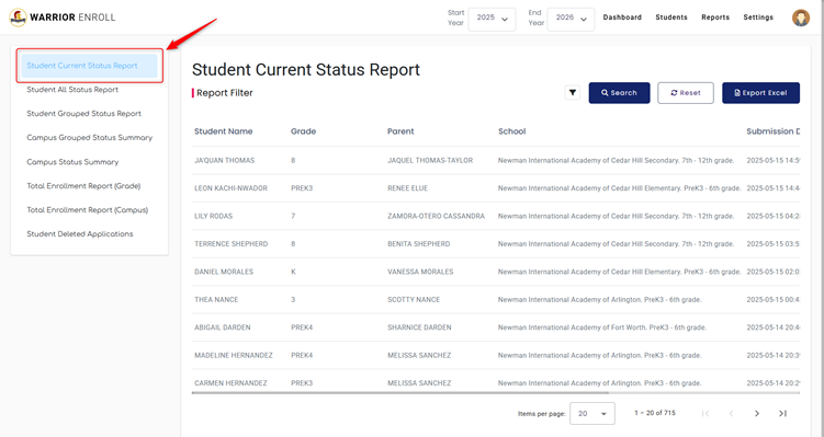 Displays the latest status of each student along with basic enrollment information. This report is ideal for viewing the real-time snapshot of student applications.