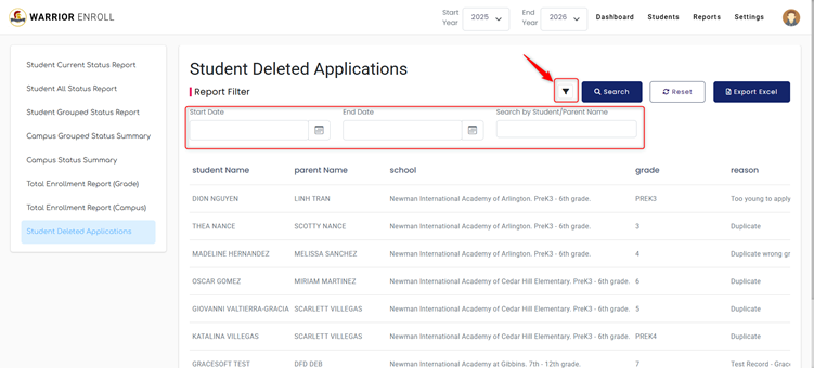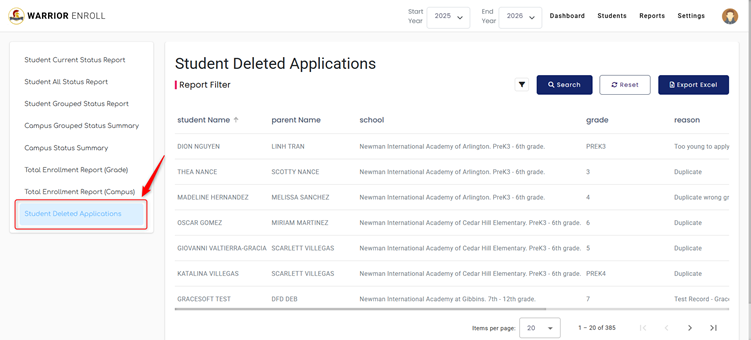 Lists all student applications that have been deleted. This report is helpful for audit trails and data recovery oversight.
